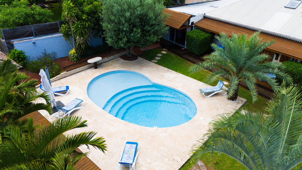 Piscine centrale et cuisine extérieure équipée.
